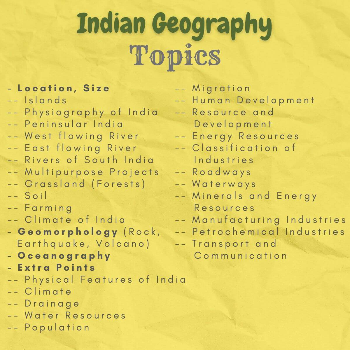 ➔ Extra Points (Physical Features of India, Climate, Drainage, Water Resources, Population, Migration, Human Development, Resource and Development, Energy Resources, Classification of Industries, Roadways, Waterways, Minerals and Energy Resources, Manufacturing Industries, Petrochemical Industries, Transport and Communication)