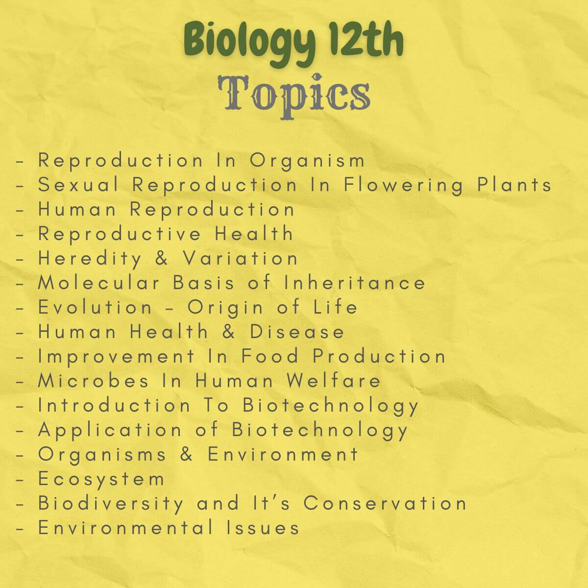 ➔ Reproduction In Organism, Sexual Reproduction In Flowering Plants, Human Reproduction, Reproductive Health, Heredity & Variation, Molecular Basis of Inheritance, Evolution – Origin of Life, Human Health & Disease, Improvement In Food Production, Microbes In Human Welfare, Introduction To Biotechnology, Application of Biotechnology, Organisms & Environment, Ecosystem, Biodiversity and It’s Conservation, Environmental Issues